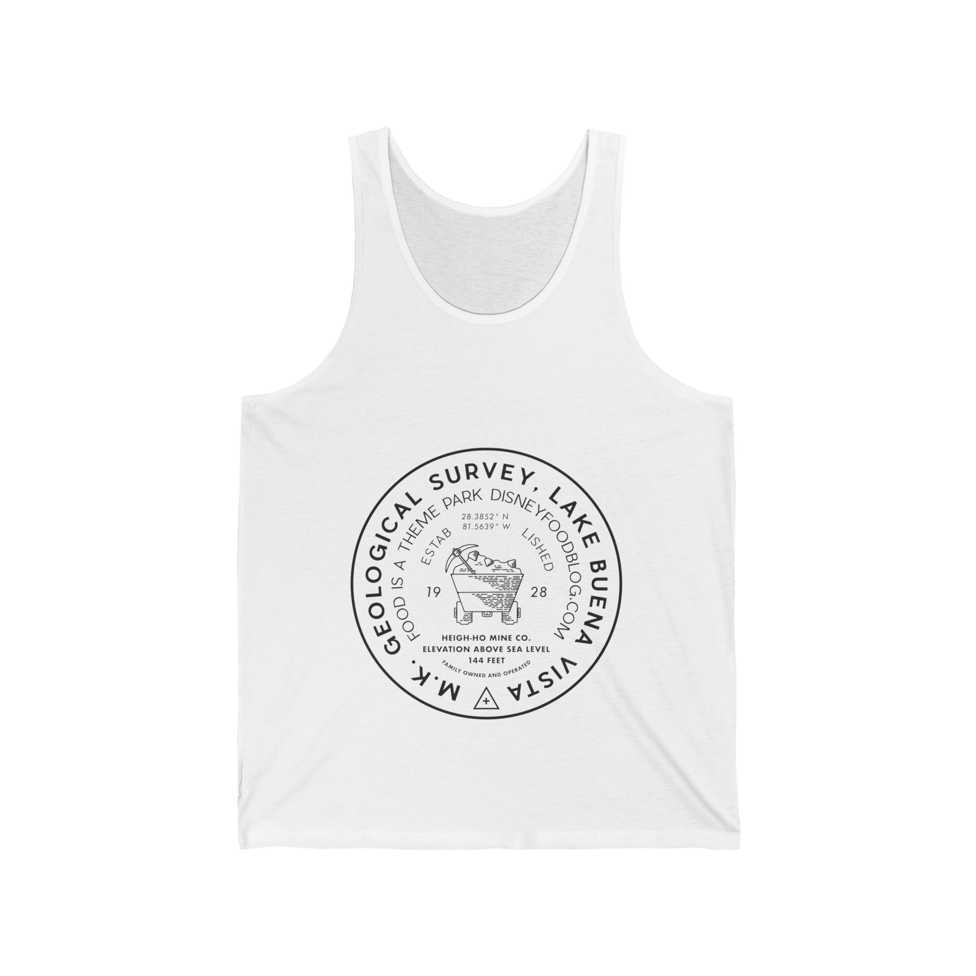 Shirt reads: M.K. Geological Survey/ Lake Buena Vista / Heigh-Ho Mine Co. / Elevation Above Sea Level / 144 Feet / Family Owned and Operated